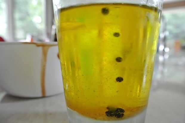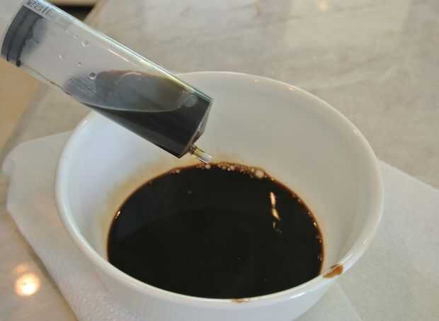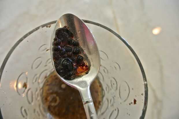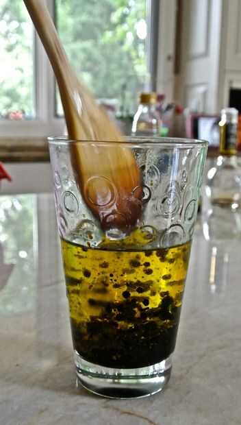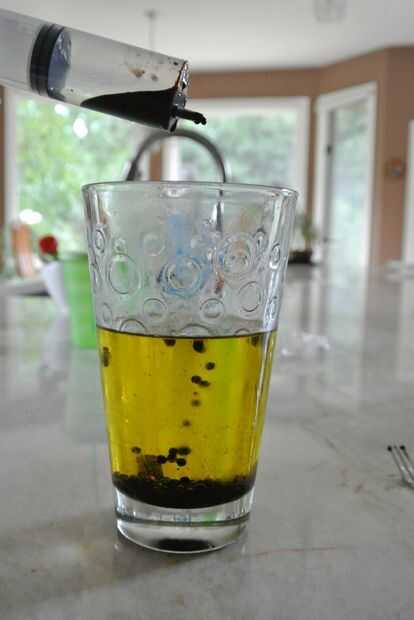 Ahora la parte cool: retirar el balsámico del fuego y sacar el aceite frío del congelador. Llene la jeringa con la mezcla de vinagre y apriete para rociar el vinagre en el aceite. Cuando el vinagre el aceite frío, las gotas se solidifican en pequeñas perlas. Algunos de ellos no podrían caer hasta el fondo inmediatamente, pero eso está bien. Revolver el aceite para que todos caigan al fondo y solidificar. Mantenga las perlas en el aceite hasta que esté listo para servirse