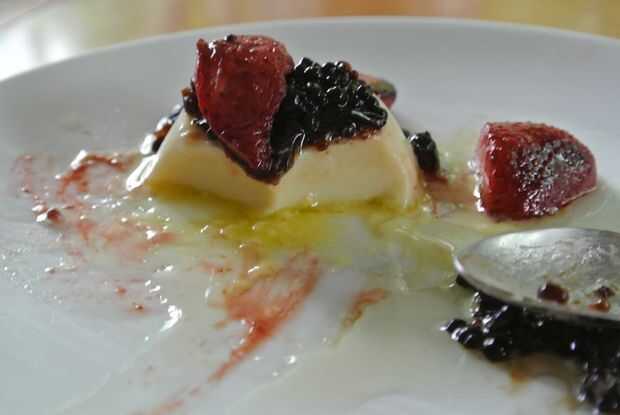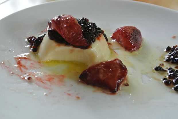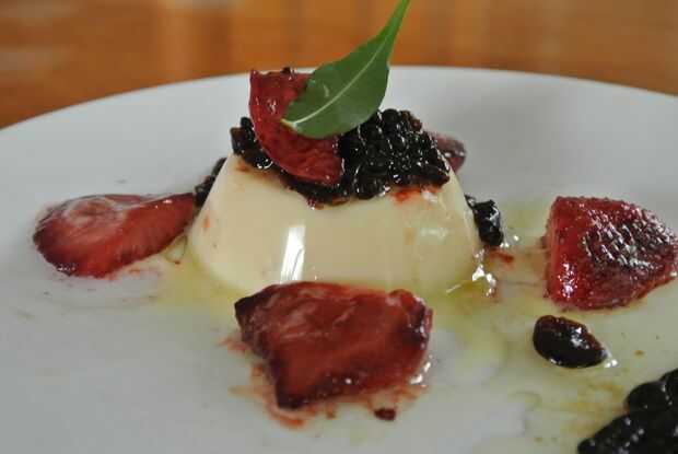 Coloque las fresas caramelizadas en y alrededor de la panna cotta y que se vea bonito! Asegúrese de incluir la salsa. Luego, utilizando una espumadera, sacar las perlas balsámicas del aceite de oliva y colocarlos sobre la panna cotta para formar un montículo, en la parte superior. Si usted quiere, rociar un poco de aceite de oliva y balsámico para un toque final.