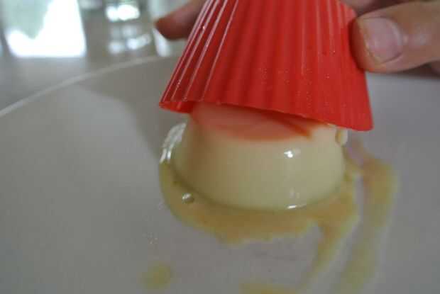 Tomar la Panacota completamente fría de la nevera y a menos que usted está usando una copa de vino, desmoldar. Para desmoldar, quiere sumergir los moldes en agua caliente hasta que la panna cotta comienza a aflojar para arriba. Luego, utilice un cuchillo de mantequilla para aflojar los bordes del molde. Voltee el molde sobre el plato de servir y sacúdala un poco hasta que caiga.