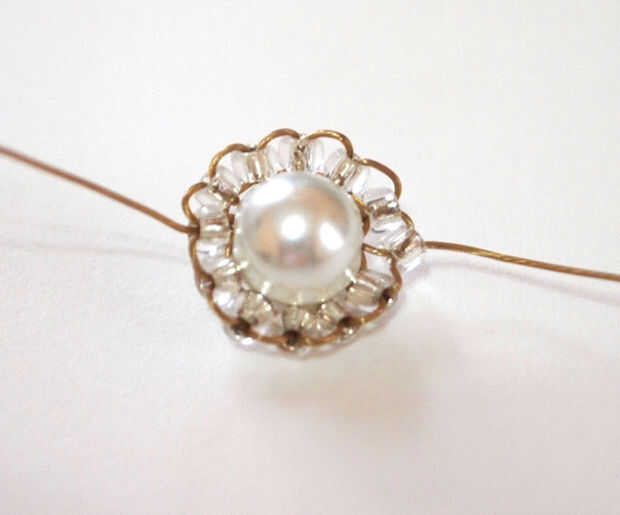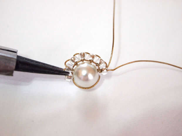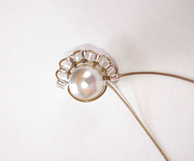 Tome el cable nuevo y ponerlo a través de la misma cuenta que el otro cable es tirado a través. Puede empujar a un lado el otro cable y seguir rebordear con el segundo alambre. Puesto que hay solamente una bola en ella, necesitará otro cordón de la secuencia. Luego toma alambre y ponlo bajo y a través de la larga de alambre se envuelve alrededor de la parte inferior de la perla (exactamente igual que con todos los granos previamente). Luego tiran a través y poner el cable a través del segundo talón y continuar hasta llegar al final.