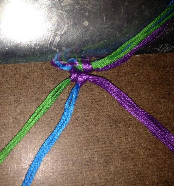 una pulsera bastante sencillo que sólo requiere 1 nudo.  Utilicé 4 colores (1 azul, rojo 2, naranja 3, amarillo 4) pero se puede elegir en cualquier lugar entre 3-8 colores.Materiales que necesitas:-Cadena (a veces llamada seda en tiendas de artesaní