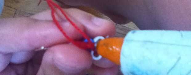 Para el último paso, añadir un punto de pegamento en la parte posterior del diamante del grano Perler conectado al pendiente. Agarra el nudo en la parte posterior y coloque sobre el pegamento. Recorte de seda del bordado rojo exceso! Listo!