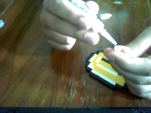 Coge el pegamento y colocar tu arte. Lugar una pequeña cantidad de pegamento en la parte superior media. ESPERAR de 3 a 5 minutos que se seque o caerá! Después de secado, aplicar más pegamento alrededor del talón.