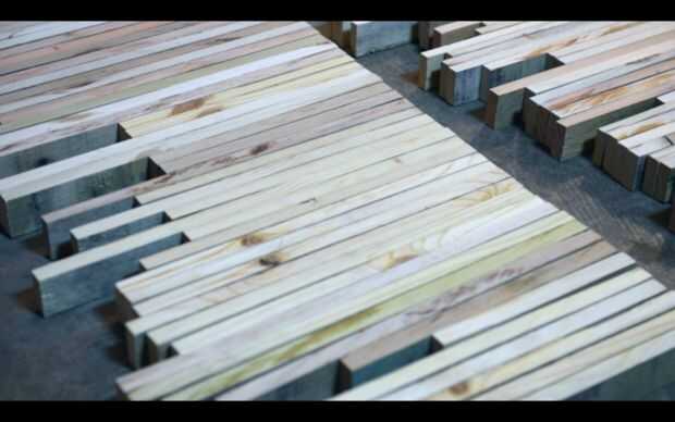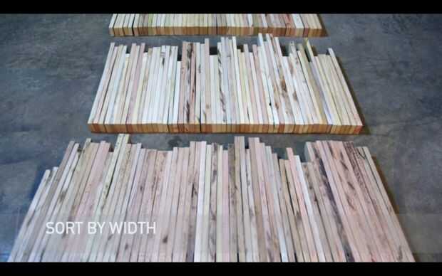 Finalmente ajuste el protector a la anchura que desee la tabla que. En nuestro caso, es 1.5". Recorren cada junta esto para acabar con un montón de placas amplia de 1.5" de diferentes longitudes. Los cortes hacia abajo, desea organizar en grupos de espesor similar. Esto ahorrará tiempo más adelante durante el pegado.