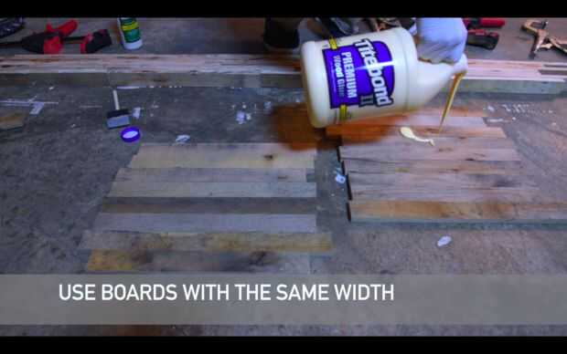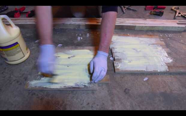 Tomar las tablas de anchos iguales y los ponen abajo de plano, por lo que tiene un "piso" de tablas. Agarra su cola y repartidas en todos los tableros. Realmente desea extender el pegamento sobre cada placa única a la vez. Basta con hacer a un lado de los tableros, pero ser generoso con el pegamento. Use un cepillo para esparcir el pegamento uniformemente a través de las juntas.