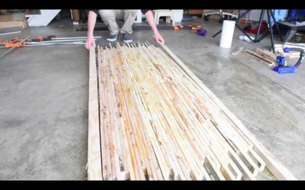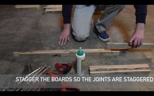Empezando por los más cercanos a usted, los tableros de pie en el extremo y presiona uno contra el otro. Que va a hacer este registro por registro, presionando el lado pegado de la fila a la parte trasera de la fila delante de ella. Para ello, desea asegurarse de que las juntas de culata de dos juntas en una fila no alineados con los de una fila adyacente. Esto es importante no sólo por estética sino también para la rigidez. Básicamente, las juntas deben ser escalonadas todo el camino hasta la superficie. También tome nota de cuánto las tablas pegan el extremo, usted siempre puede ajustar hacia abajo, pero realmente no queremos que sobresalgan más de 12 pulgadas.
