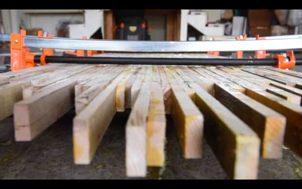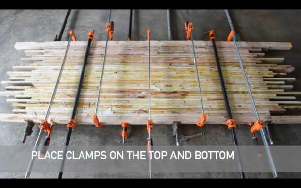 Una vez que todas las juntas se pegan, línea de la tabla con 2 tableros largos, arrastrados y utilizarlos para sujetar los tableros pegados juntos. Usé 2 "x 2" en el video pero quisiera que yo había utilizado acero. Habría hecho aún más presión a lo largo de tableros. Quieres 1/2 de que las abrazaderas que por un lado de la mesa y la otra mitad en el otro lado. Se trata de dejar las pinzas de inclinando la tabla como se seca porque las abrazaderas se tira uno contra el otro.