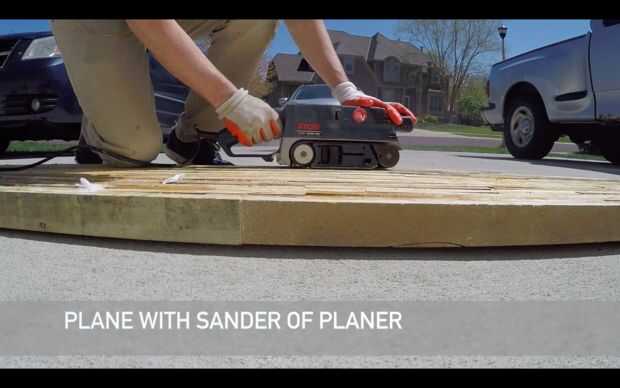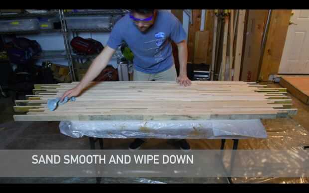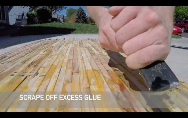 Después de 24 horas Quite las abrazaderas y tomar su mesa fuera. Coge una rasqueta de mano (o cepillo) y eliminar el exceso de pegamento. Acostumbraba el raspador plano abajo algunas placas particularmente combados. Una cepilladora de mano funcionaría de maravillas aquí, pero no tiene uno. Tan en su lugar utilicé papel de grano arena 36 y arena durante unas 2 horas! sí fue un largo proceso! Yo también sólo lijado un lado porque quería dejar la aspereza de la parte inferior.