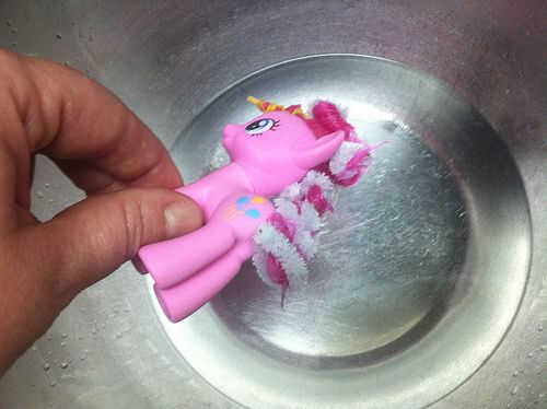 4. Sujete la Pinkie Pie boca abajo por los pies. Sumergir la cabeza y parte posterior en el agua caliente, asegurándose de que todo su pelo envuelto se moja. No toque el agua y no recibe sus piernas o pies mojados - eso es lo que está sosteniendo le! No quiere quemarse.
