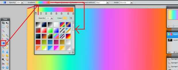 Herramienta degradado , haga clic en el botón, luego haga clic y arrastre la imagen para aplicar un degradado de color a la parte de la imagen. Los colores del degradado que provienen de los parches de dos colores en el panel de herramientas (generalmente blanco y negro como los valores por defecto). Cambiar los parches de color para cambiar los colores utilizados en el gradiente. También puede modificar el tipo de gradiente cambiando las opciones en la parte superior de la pantalla.