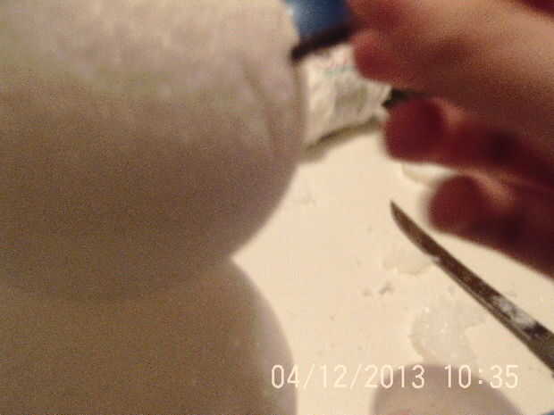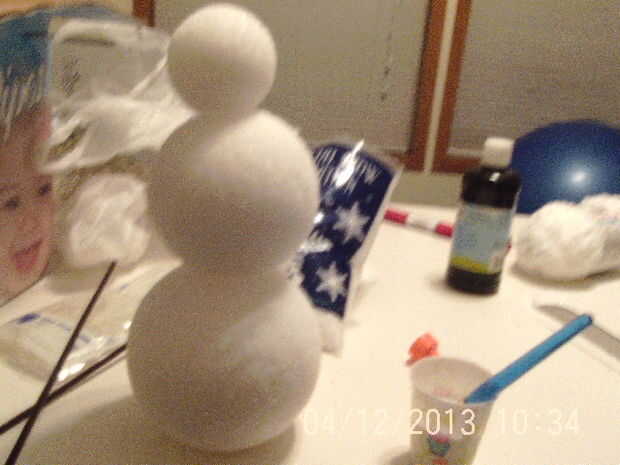 Acumula tus bolas de espuma de poliestireno para hacer la forma de su muñeco de nieve y encolarlos. Si fuera establece las bolas un poco, los inclinando a le da una mirada tonta:)