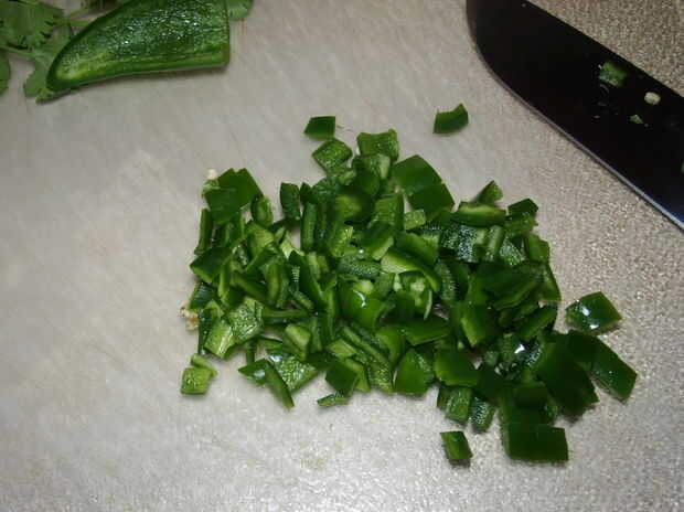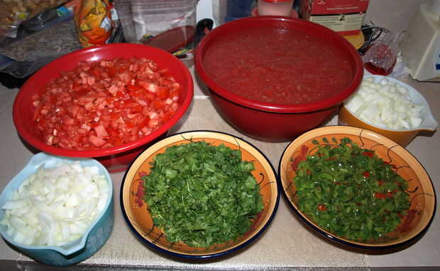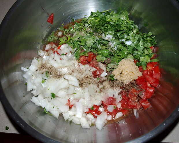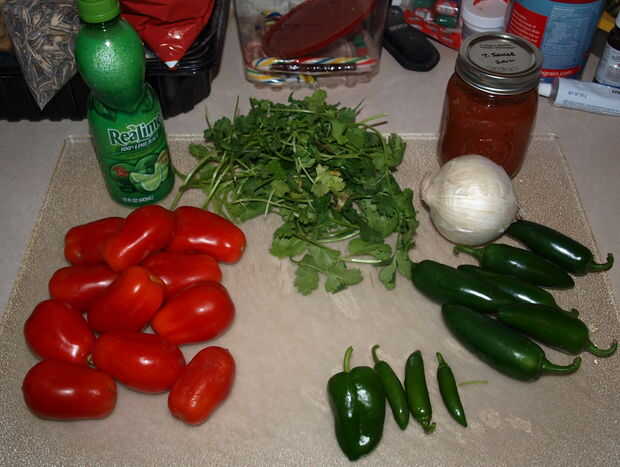 Primero reunir los ingredientes y picar para arriba. De jugoso tomate Roma, jalapeño, Serrano, chiles. Algunas cebollas, cilantro, sal, ajo y un pimienta al gusto. Yo jugo medio Roma y picar fino la otra mitad. Picar fino la cebolla y el cilantro. Asar los pimientos para mejor sabor, luego la semilla y picarlos fino