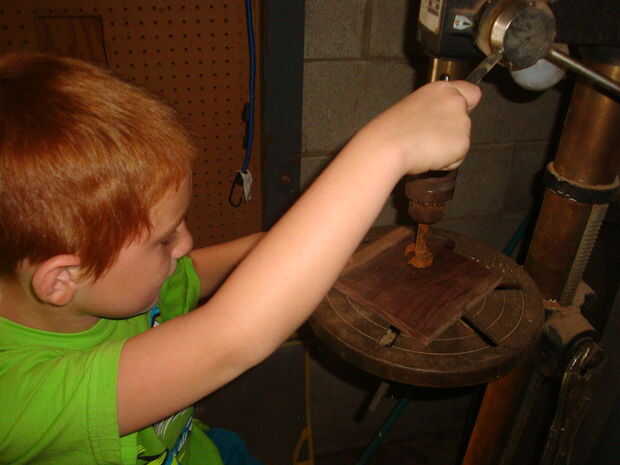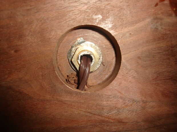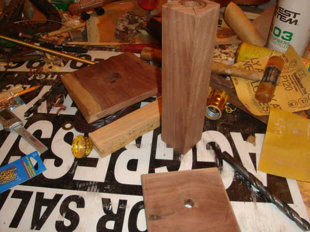 . Utilizamos el taladro para perforar un 9/16" hoyo a través del centro de la parte caso de bomba a fondo esto tomó un poco más largo que yo había así perforé desde la parte superior convertido encima y perforados de la parte inferior. Aunque no se conocieron en el centro. La parte superior de la base que hemos perforado con 9/16 bits, pero el primero en la parte inferior de la base tuvo que ser perforado con un 3/4" bit para permitir que el tubo de cable y cableado para estar debajo de la superficie se sentaría plano también un 1/4 agujero perforado a través del lado en el agujero de 3/4" para el cable