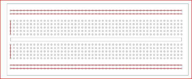 La brecha en el medio es para que pueda colocar sus ICs para que cada pata del CI está en una línea separada de la vertical de los agujeros por encima y por debajo de la brecha. Ver otra imagen a medida que avanzamos a lo largo.