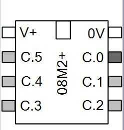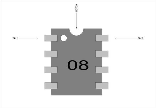 Como veis en la foto de arriba el Picaxe 08M 2 tiene 8 terminales, en la parte superior hay una muesca y puede haber un pequeño punto o círculo por el lado de la pierna 1.