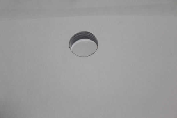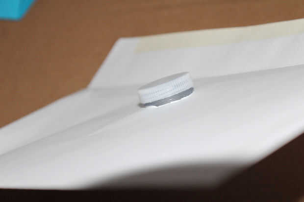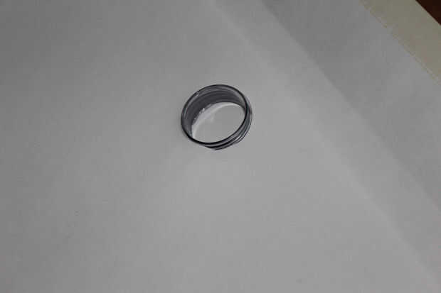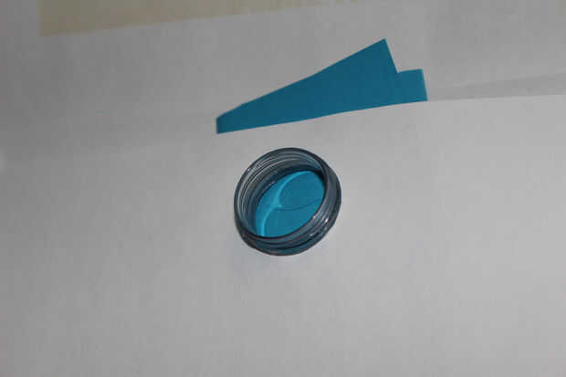 El círculo-agujero debe estar a apenas demasiado pequeño para el pedazo de rosca de la botella. Cortar el papel lo suficiente como para que usted pueda obtener la pieza roscada para atornillar en el agujero. Debe ser muy ceñido para que aun sin la tapa, no caiga. El extra que tuve que cortar era sobre un milímetro de espesor.