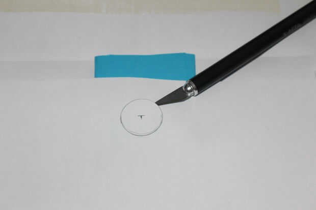 Doble un pedazo de cartulina o use una almohadilla de corte pequeño y deslizarse detrás del círculo completo en la envolvente. Usando su cuchillo, cortar el círculo totalmente.