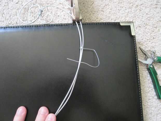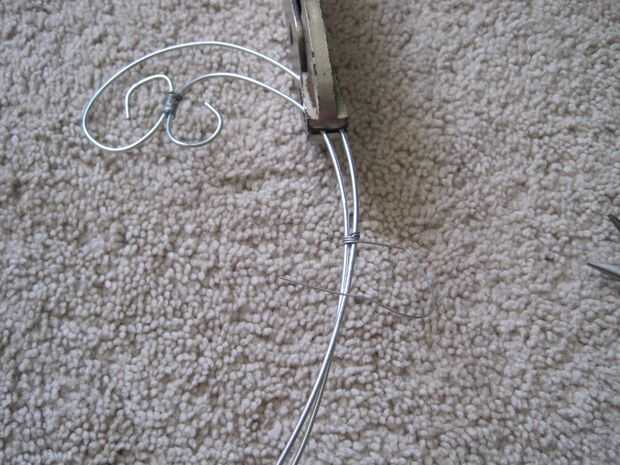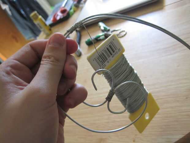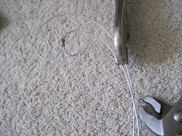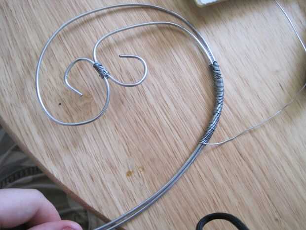 Una vez que se conectaron los dos bucles partidos, pude comenzar doblando la curva principal del perno. Desde que supe que los dos cables necesarios para ambos se entrecruzan siguiendo el mismo tipo de forma de la curva, decidí que sería mejor sujetar los dos cables juntos y trabajarlos como una sola unidad en lugar de individualmente. En los siguientes pasos verá pequeños trozos de alambre manteniendo las piezas juntas mientras se forma. Altamente recomiendo hacerlo como mantener todo en su lugar y asegurados. Como empecé a doblar los alambres para hacer la curva principal, permitieron los cables se deslicen un poco para ajustar las diferencias de longitud. Cuando yo estaba satisfecho por la forma, comencé a conectar los cables envolviendo. Me tomó un poco para iniciar el proceso hacia abajo y como resultado algunas de las primeras vueltas son un poco de mala calidad. Sin embargo, puede ocultar sus errores fácilmente comprimiendo toda la longitud de la envoltura con los alicates una vez que esté terminado.