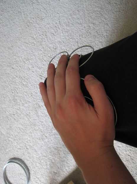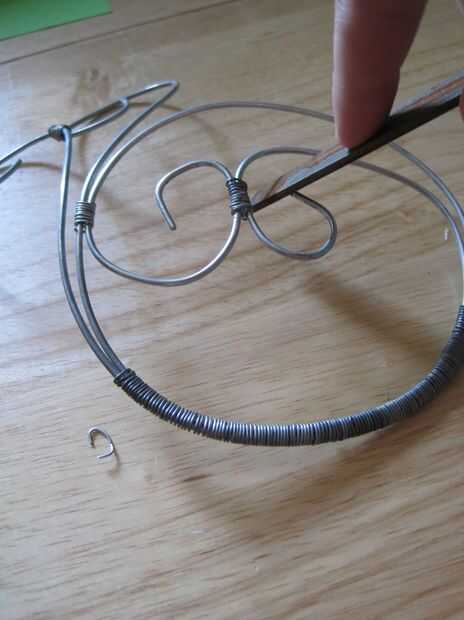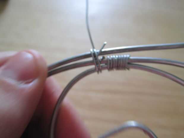 En este punto, hice un segundo intento de unir los tres cables que se cruzan juntos en una sola envoltura. Sólo que la última vez, no mantenerlos alineados. Por lo que en cambio retirar la envoltura temporal conectando los dos cables y lo reemplazó con uno que parecía un poco más agradable. Una vez que finalizaron las vueltas, regresé con el archivo otra vez para quitar cualquier filos que han sobrevivido y doblado la horquilla entera en un general "cabeza en forma de" curva.