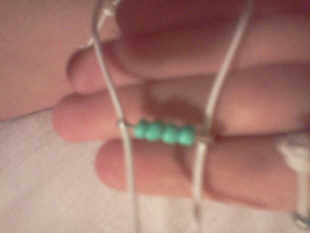 A continuación, empezar a encadenar los pernos poniendo el extremo de una cuerda por un extremo del perno y hacer lo mismo con la otra cadena por el otro extremo del perno. Seguir adelante hasta que tenga suficientes pines (esta especie de depende de lo que usted quiere ser como el, pero asegúrese de que usted será capaz de hacerla grande/lo suficientemente pequeño para su dedo).