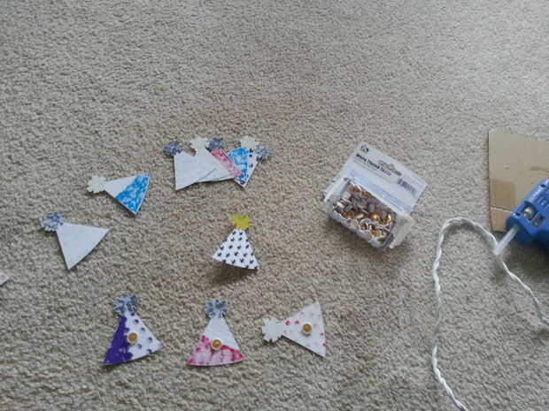 Mientras se secaba mi corkboard utilicé papel de construcción blanco para recortar formas de sombrero pequeño (plantilla que encontré en línea gratis) y un lado de color con marcador. Luego les laminado y Unido dólar tienda chinchetas de cabeza plana (sólo un Consejo, poner en la parte superior del sombrero se columpie en alrededor de su propio).