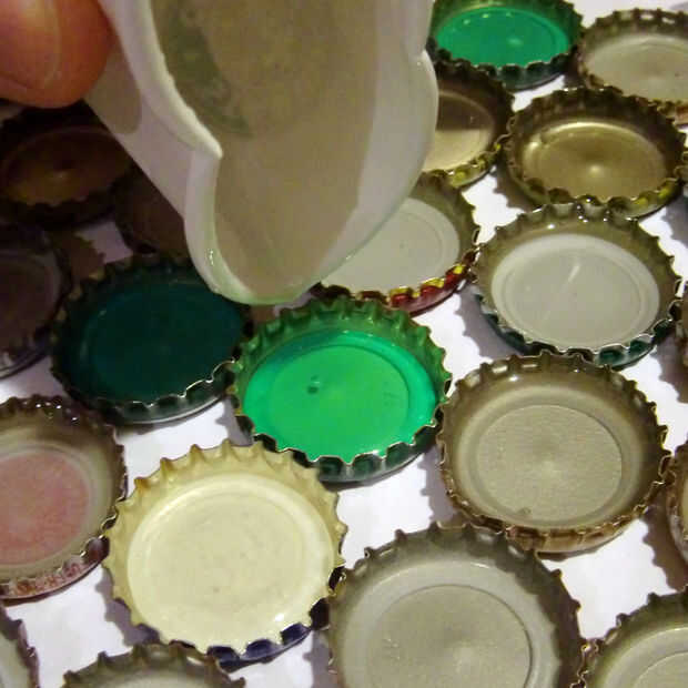 La resina se vierte cuidadosamente en cada tapa de la botella, llenado sólo a mitad de camino. Aproximadamente la mitad de la resina y el endurecedor utilicé para mi 80 casquillos (cada botella es de 4oz [120ml] y usé 2 onzas [60ml]). Después de verter volví con un nuevo palo de revolver y asomó por las imágenes que habían flotado en la parte superior o de lo contrario estaban desalineados. Permita que la resina curar durante la noche.