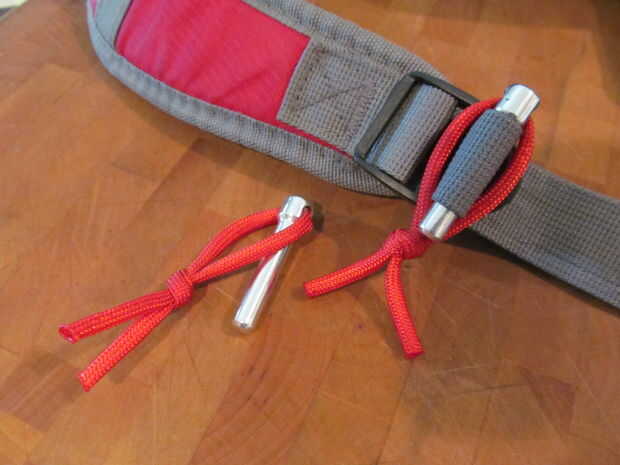 Algunas mochilas tienen los extremos de las correas ajustables doblado sobre y cosido. Si la bolsa es como mina, solo deshacer la costura con un cuchillo. Doblar la cinta y colócala en la hebilla ajustable. Inserte el perno a través del bucle que acaba de crear y tire el paracord encima. De liberación rápida simplemente tire del lazo de la clavija y sacarla de su.