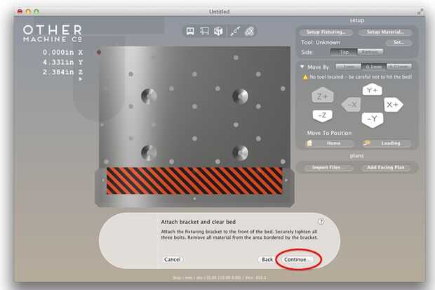 1. encender la Othermill y la casa la máquina pulsando el botón "Iniciar autoguiado hacia el blanco". Haga clic en el botón "Cargar" para adelantar la cama.