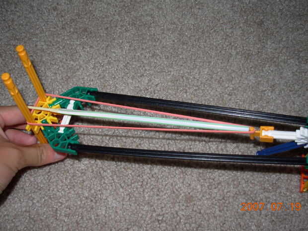 Para cargar, forma la parte posterior del perno en la goma elástica en la espalda tanto como sea posible para que no caiga y coloque la punta del perno en la banda de goma alrededor de los pedazos de naranja y rojo en la parte delantera.