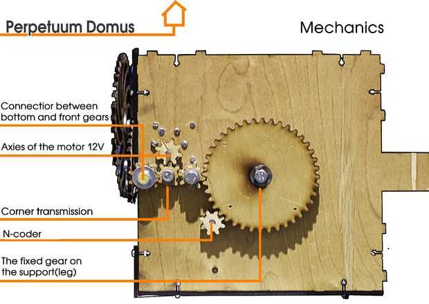 La construcción del modelo se fija en el eje central que pasa a través del centro de la casa y que se extiende en el soporte en el marco descansa sobre un cojinete de empuje. Se encuentra entre el engranaje principal y el bastidor base.