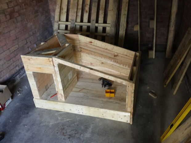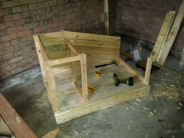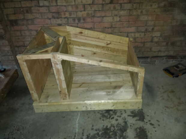Construí el marco de la perrera de alguna madera bastón que había dejado de la colocación de una valla de piquete en el jardín. I luego revestidos el interior y el exterior del marco con la plataforma de madera para hacer las paredes de la cavidad. Chaflanado los bordes de las juntas exteriores, sin ninguna razón más para que se vea más bonito.