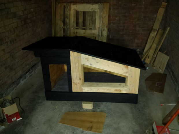 Empecé haciendo un marco dentro de la abertura de la puerta con algún listón de techo que robaron de mi papá. Los ángulos con herramientas mínimas y una sierra de mano fue complicado. Luego hizo los 4 paneles exteriores de madera de palet y había chaflanado todos los bordes. Yo les in situ con clavos pegamento y brad sujetado antes de quitar la puerta para atornillarlos debidamente.