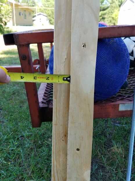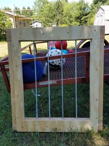 Tome un montante de 27", se trata de la parte superior. Fije ambos 23" postes de madera cuadradas a los extremos de la tapa 27" sujeción a la pieza de madera contrachapada. tendrá que dejar un espacio de 1 13/32" en los lados del borde de la madera contrachapada al borde de los montantes. ver foto 2. una vez en su lugar, utilice sus tornillos pequeños para acoplar la madera contrachapada a. después se conectan los 3 lados, pre perfore los agujeros de la varilla con broca de tamaño adecuado. He utilizado varillas de 1/4", asi broca para taladro de 1/4 usado". Medida hacia fuera dentro de distancia y uniformemente orificios para varillas de perforación de aproximadamente 1/2". hacer esto para la parte superior e inferior, la pieza inferior de sujeción en pero no atornillar abajo. después se perforan todos los agujeros, coloque barras en madera superior. puede que desee utilizar un mazo de goma para empujar más. entonces pedazo de fondo del lugar en las varillas y también libra en. una vez barras todo lo Atornille el perno inferior a la madera contrachapada. después de asegurar, quitar el centro de la madera mediante una sierra circular o sierra de hoja pequeña, dependiendo de lo que usted tiene acceso a. Por ahora, se puede colocar la puerta al lado.
