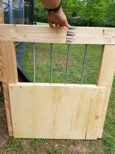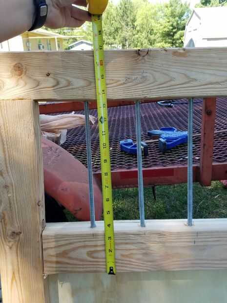 Tomar 1 27" stud y dos postes de madera de 23" y sujetar postes de madera de 23" a base de 27" en ambos extremos. con sus grandes tornillos, taladre los extremos de los 27" en un ángulo en los montantes de 23". Tomar el segundo perno de 27" y adjuntarlo a la parte inferior de los postes de madera de 23". en la parte superior, pre taladre los orificios de la varilla como en el paso 1. Mida en el perno 20" la misma distancia entre barras. colocar barras en la pieza de arriba después de que los agujeros se perforan, libra en el lugar y luego añadir el perno 20". su distancia desde la parte superior a inferior de la viga de 20" debe ser poco más de 17". Este número no necesita ser más exactos. Fije la madera contrachapada en la parte inferior, debajo de las varillas, dejando el mismo espacio como lo hizo en el paso 1.