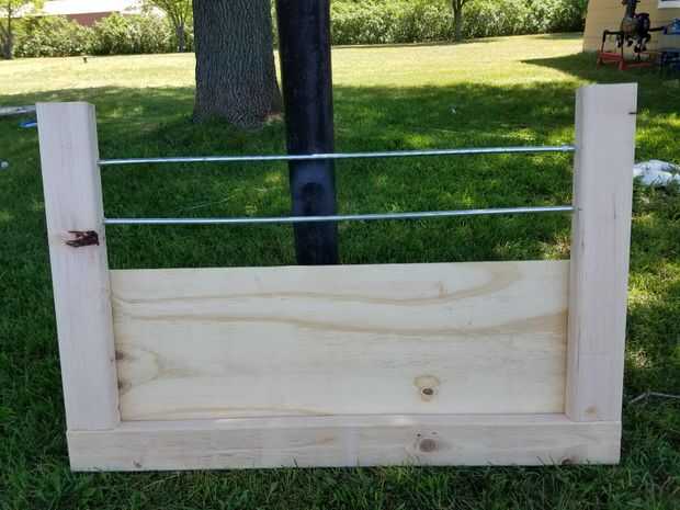 Tomar 1 40" perno y colocar un poste de madera de 23" a un extremo de la misma. (23" debe estar en la parte superior 40"). Fije utilizando una pieza de madera contrachapada, dejando una separación de 5/8" en los lados. Mida en el 23" prisionero entre la parte superior y la pieza de madera contrachapada para 2 barras uniformemente espaciadas. abrazadera del lado opuesto 23" pieza en madera contrachapada en el lugar y medida para espaciamiento de barra. Taladre agujeros. Coloque barras en poste de madera en el lado seguro en primer lugar, luego en la pieza libre flotante. seguro segundo 23" pedazo de madera contrachapada después de varillas se colocan completamente en los pernos prisioneros. Instale la pieza superior utilizando tornillos grandes y perforación de la pieza de arriba en un ángulo en las piezas laterales. Repita para el lado 2.