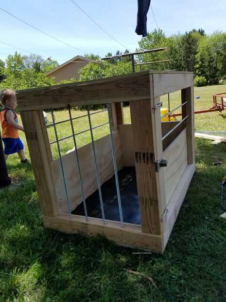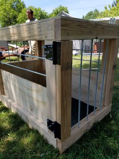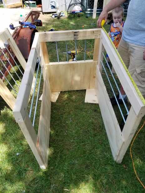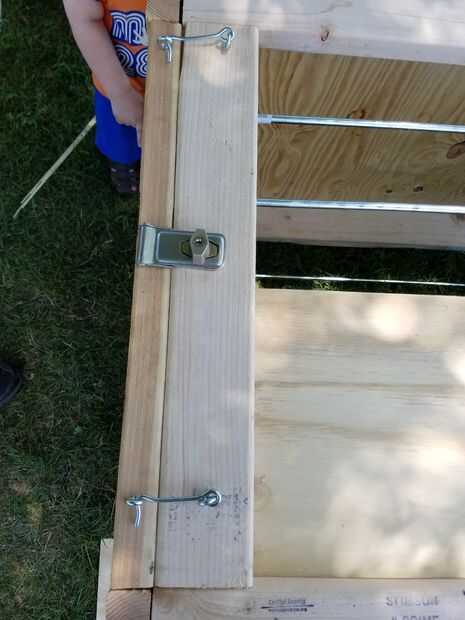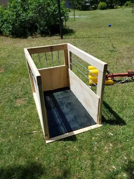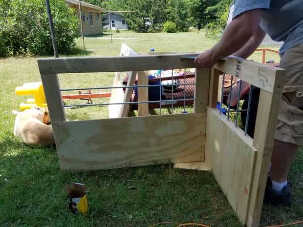 Luego colocar la puerta en la parte delantera. una vez que la puerta está perfectamente en la parte delantera, tomar sus bisagras y uno de los lados de la puerta. He utilizado pernos de carruaje de 2 1/2" para fijar la bisagra al lado de la perrera, a continuación, los tornillos para el lado que se conecta a la puerta.