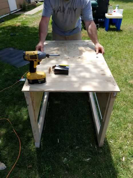 Tendrá todos los lados preensamblados para este paso, así como 2 piezas de madera cortadas a 27 "x 43". Comience colocando la parte trasera a un lado. Utilice los tornillos grandes para fijarlos juntos desde el extremo. hacer partidos seguro superiores para arriba y que el interior contrachapado se sienta cómodamente uno al otro. Añadir el otro lado el proceso hacia atrás y repetir.