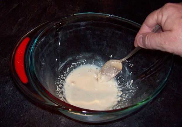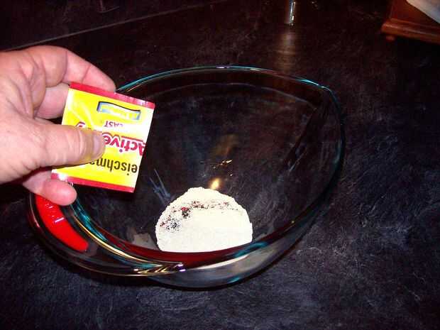 Precalentar el horno a 350 grados. En un tazón grande, mezclar el paquete de levadura con alrededor de 1/4 taza de agua tibia y remover bien hasta que se disuelva.