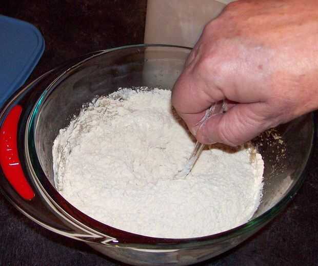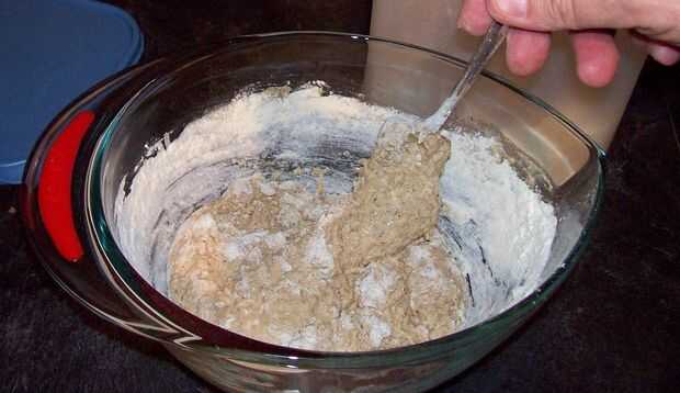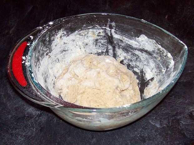 Generalmente comienzo mezclando 2 tazas de harina de trigo integral con la mezcla de caldo. Wil volverse una pasta pegajosa! Seguir agregando harina en media taza de incrementos hasta tener una bola de masa pegajosa pero firme. Si usas demasiada harina solo añade un poco de agua caliente.