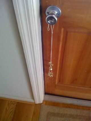 Tome sus cascabeles recién atado a la puerta. Mantenerlos hasta aproximadamente a la altura de la nariz de su perro. Que no desea tener que saltar y arañar la puerta. El sujetador de la cadena con los dedos, manteniendo la longitud correcta. Luego atarla con un nudo. Colgar en el pomo de la puerta para verificar la longitud. Si todo está bien un nudo un par de pulgadas por debajo del primer nudo así que puede deslizarse sobre la perilla.