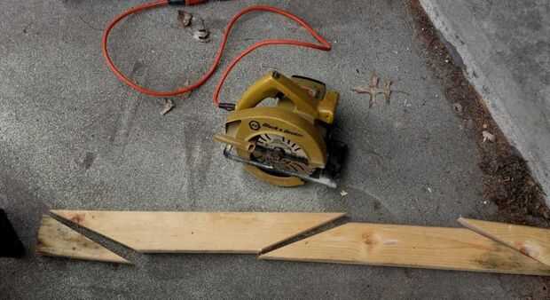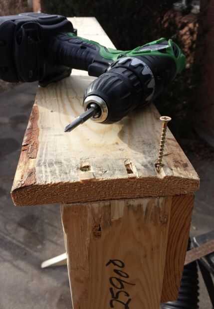 Para hacer las patas del marco había planeado utilizar un dos por cuatro de esta plataforma (quitada en el último paso), pero ocuparon bastante, así que cogí uno que había dejado desde una plataforma diferente. La junta fue de 44 pulgadas de largo. He marcado en el centro, luego marcó 4" del centro en los lados opuestos y marcó una línea diagonal entre estos dos últimos puntos. Hice una línea con la misma pendiente en cada extremo de la tabla para crear el patrón para los dos pies. Marcado los pies en el centro y el 12 en la parte inferior del marco en sus centros, emparejado para arriba, pretaladrado de los agujeros y condujeron en tres 3 1/2" tornillos para sujetar los pies a la estructura. Ahora está parado en sus propios dos pies!