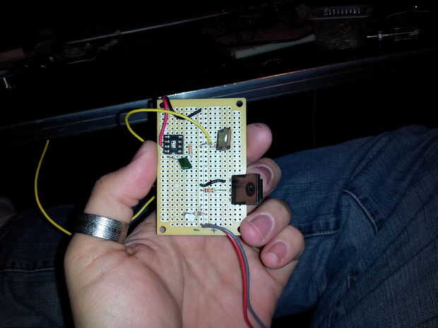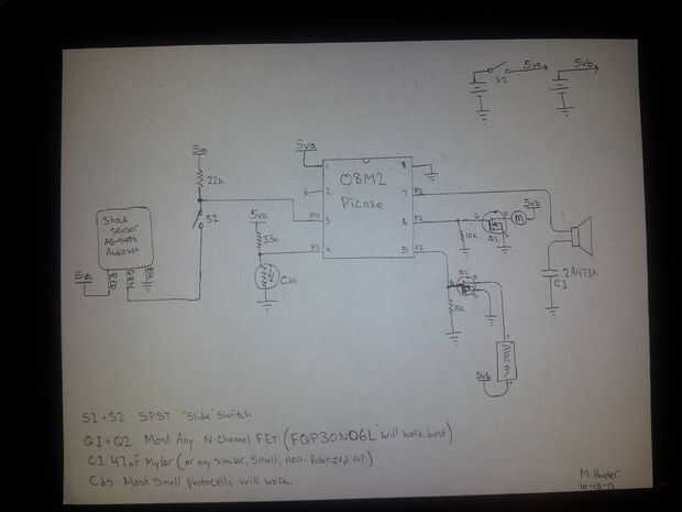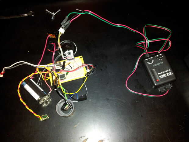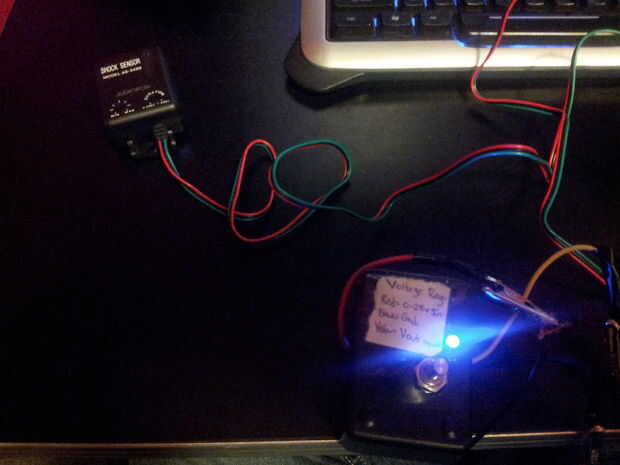 El sensor de "shock" (vibración) que utiliza es un Audiovox estándar, sensor de choque de estilo automático de alarma. Creo que está diseñado para ejecutarse en 12 voltios pero funcionó a la perfección para mis propósitos incluso a 5 voltios. Tiene sensibilidad ajustable por lo que es capaz de detectar pequeñas vibraciones hasta los golpes más grandes. Usted debe ser capaz de obtener una tienda en línea mediante la búsqueda o en una compra mejor o similar que vende sistemas de radios y alarmas del coche etc..