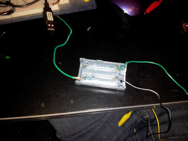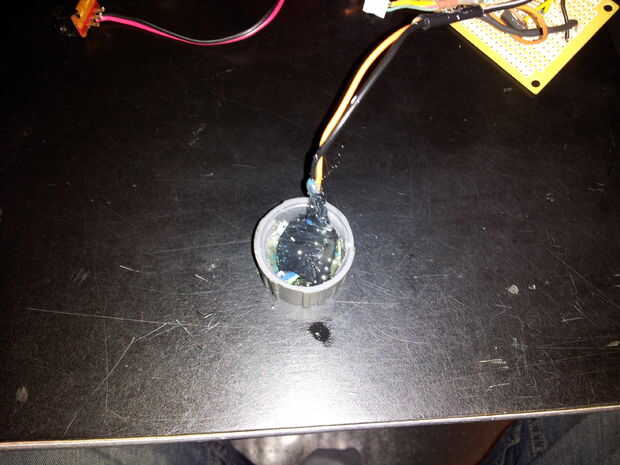 Tenga en cuenta que usaba 2 baterías, etiquetados como 5Va y 5Vb, esto no es totalmente necesario pero la corriente de mi motor fue restablecer el picaxe siempre activado así que usé un paquete de baterías separado para él. También tenga en cuenta que el 5Vb puede ser de 5-12V si tienes una alarma de voltaje más alto por ejemplo. Sólo asegúrese de que la tensión que están sustituyendo sólo va la alarma de motor y no el picaxe, lo hará enfadado. No como él cuando está enojado. Hice otra cosa tonta y poner el motor pager de "estilo disco" en una tapa de la botella y luego llena la tapa con pegamento caliente. Hice esto porque el motor pager era metal y no quería ningún cortocircuito ocurre en mi caja de proyecto y porque tengo mucho tiempo en mis manos.