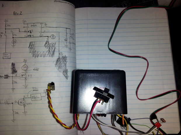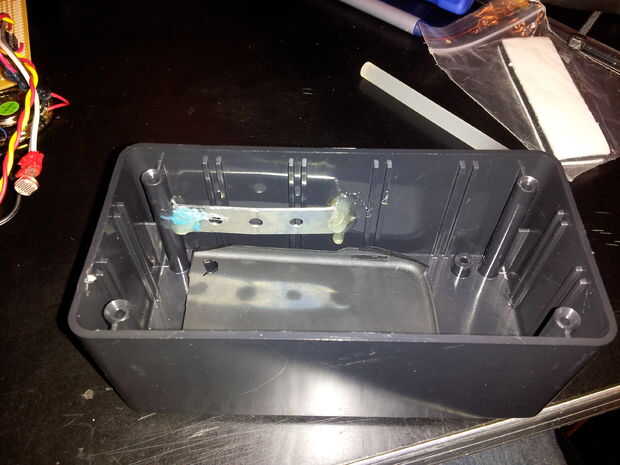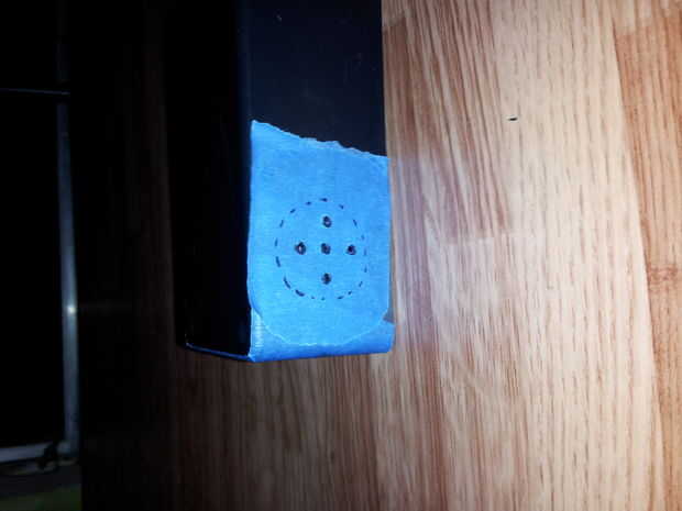 La fotocélula que picos a través de un orificio en la parte superior de la caja del proyecto se lleva a cabo en lugar con pegamento caliente. Para que sea mirada agradable puse cinta sobre el agujero y luego caliente pegado el sensor en su lugar. Cuando el pegamento caliente secando quité la cinta, que dejó un bonito agujero sensor mirando que quede al ras con la superficie de la caja de proyecto.