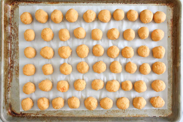 Línea de la bandeja para hornear con papel pergamino y comenzar a rodar la masa en bolas!