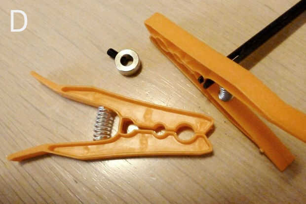 Meta el 2 cothespins (acción) en el el espacio. Haga esto en ambos lados de la barra de carbón.