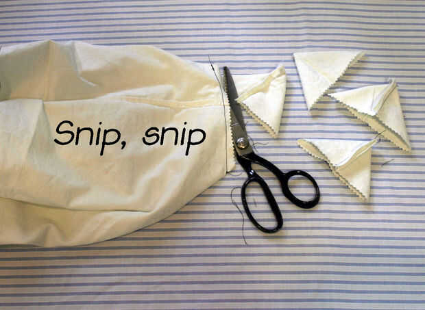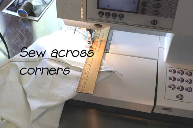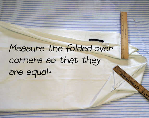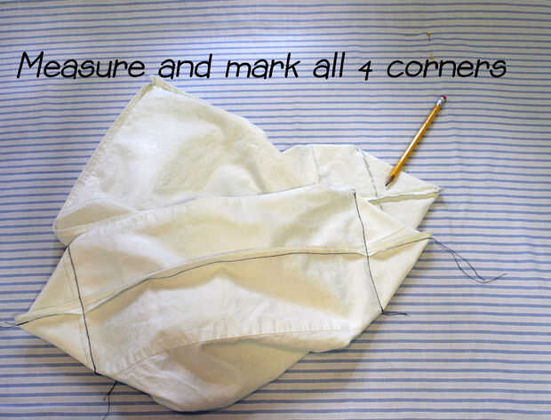 Tomar las 4 esquinas, uno a la vez, les medir cerca de 5 pulgadas o tan perpendicular a cada esquina y marque con un lápiz porque le derecho coser en esa línea. Esto es más difícil explicar que es entender - mirando las fotos se hacen claro.