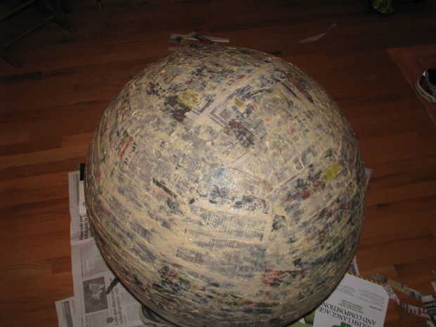 7. una vez que la bola entera se cubre con una capa de tiras verticales y una capa de tiras horizontales, deje que se seque durante al menos 12 horas. Repita el paso 6 al menos cinco veces (como mínimo!) Diez capas es más ideal. Las capas más añade, más fuerte será su silla. No te preocupes si tu capas o aplicación de goop es ligeramente desigual. No ver esto al final.