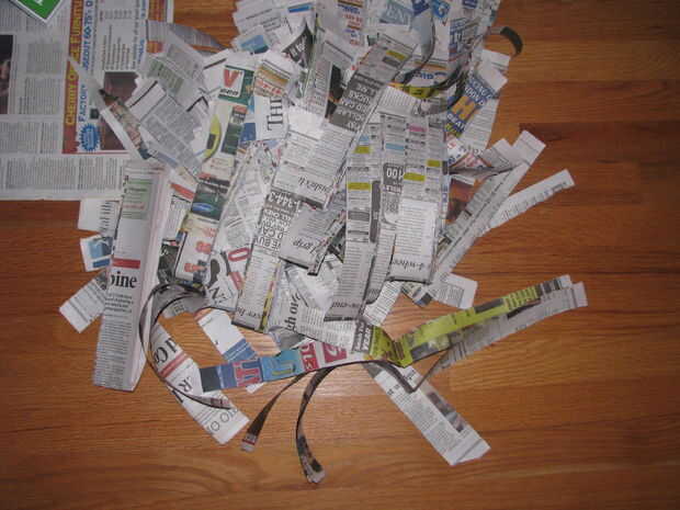 3. hacer tus tiras de periódico. Minas fueron aproximadamente 1 pie de largo y 1,5 pulgadas de ancho. Todos estos no tienen que ser del mismo tamaño, con bordes rectos o mirar bastante. Sólo asegúrese de que no son demasiado grandes, porque de lo contrario no pliegan la bola correctamente y tienes arrugas y estos no se plancha hacia fuera!