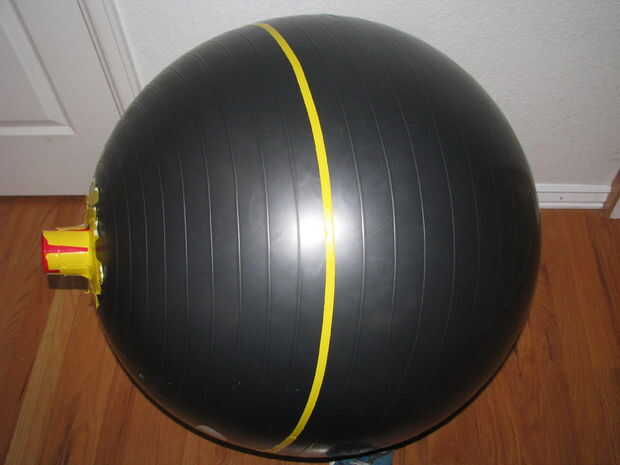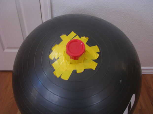 1. Haz una bola de ejercicio, yo tengo la mía en el destino, pero los venden en cualquier lugar. No ponen nada demasiado caro (la bola no será utilizable después de esto). Recomiendo una pelota de ejercicio porque no pega para el papel maché, hacer tu vida más fácil a la larga, es barato y fácil de obtener. Elija el tamaño de la bola del ejercicio según cuán grande quieres la silla. Realmente quería crear una cama del perro, por eso elijo una bola más pequeña de ejercicio.